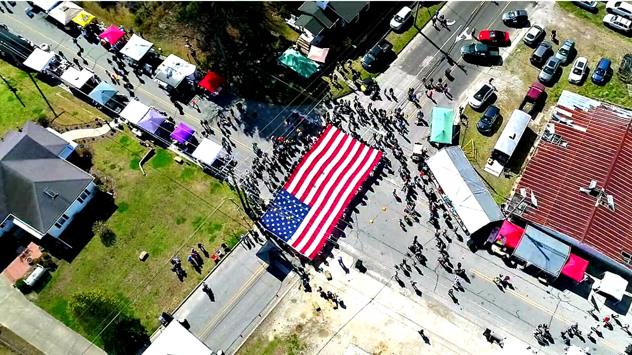 This photo taken during the 2018 Festival by the TDA Drone, "Tinkerbelle" at about 250 feet altitude above the huge flag provided by Ray Bowen of WoodmenLife. Thank you Ray Bowen of WoodmenLife and Barney Conway of Martin county Tourism Development Authority.